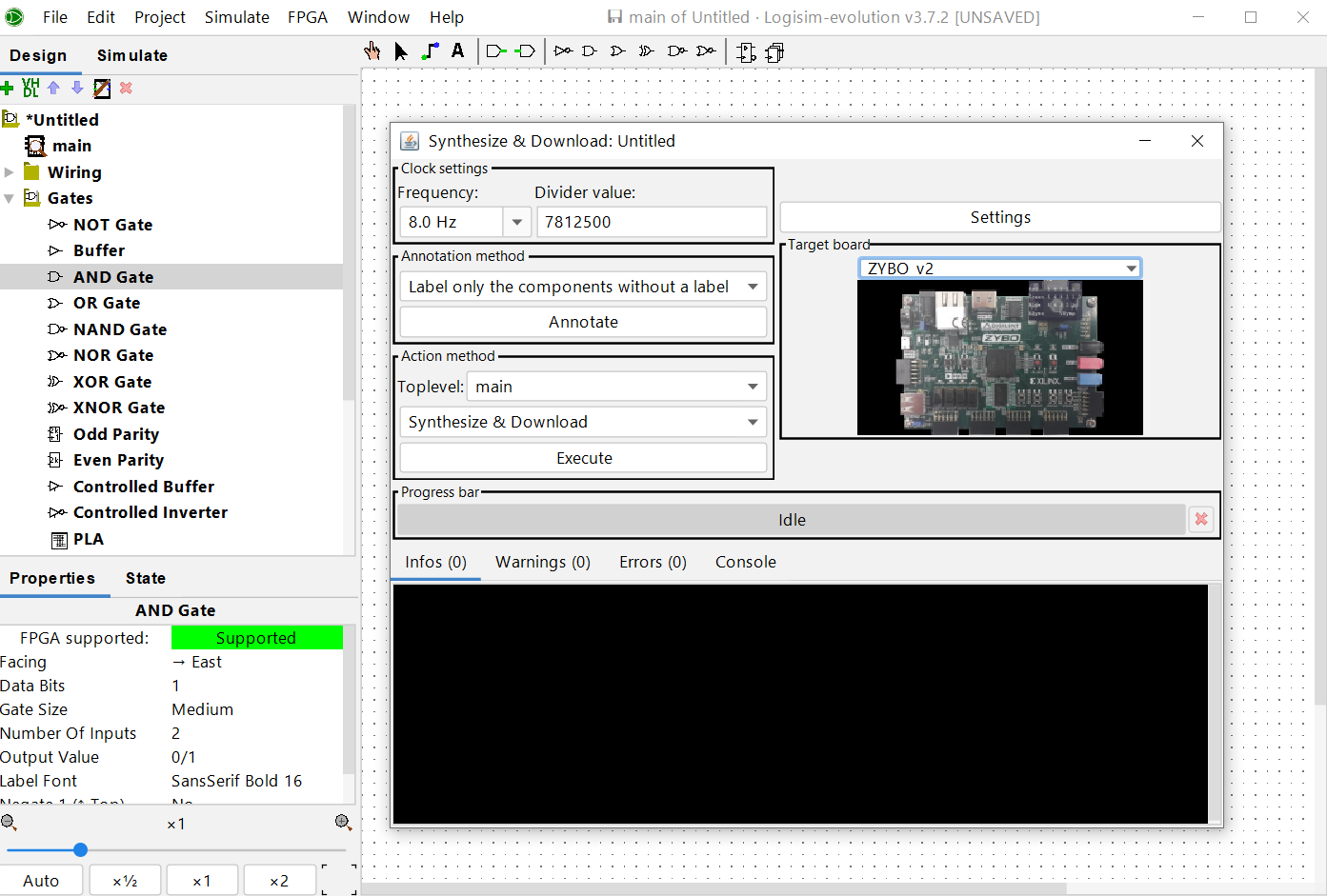 The good news is that because Logisim is free, open source and cross-platform, several developers augmented Logisim to incorporate the ability to synthesize schematics and deploy the code into different types of FPGAs.
