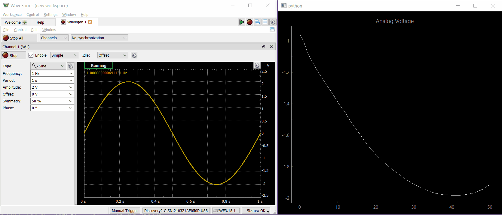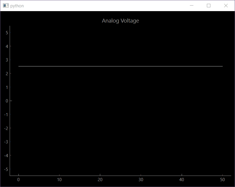 Instead of printing the results on the terminal, we can render the values on a plot. There are several ways of plotting values in python, but I will cover the two most common ones: plots using matplotlib and plots using pyqtgraph. I recommend using pyqtgraph to plot graphs with real-time rendering requirements, however both ways can be integrated with GUIs.