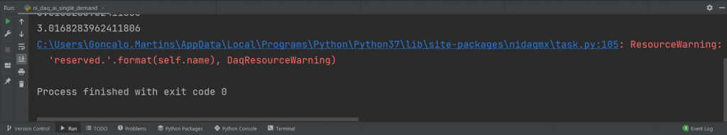 This version creates the analog task using the nidaqmx.Task() function. If you run this function, it will acquire N samples at Ts sampling time and prints the result on the terminal.