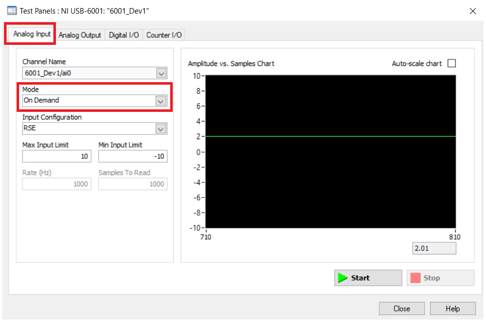 For this article I am going to show how to implement the on demand single analog input mode from the test panel NI-MAX software. I encourage to test this mode first using the NI-MAX software in order to get a better feeling what are the pros and cons of this mode before looking at the python examples.