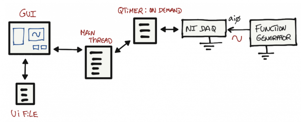 The first diagram is a generic block diagram on how the code, GUI, ui file and external hardware interact with each other in an conceptual way.