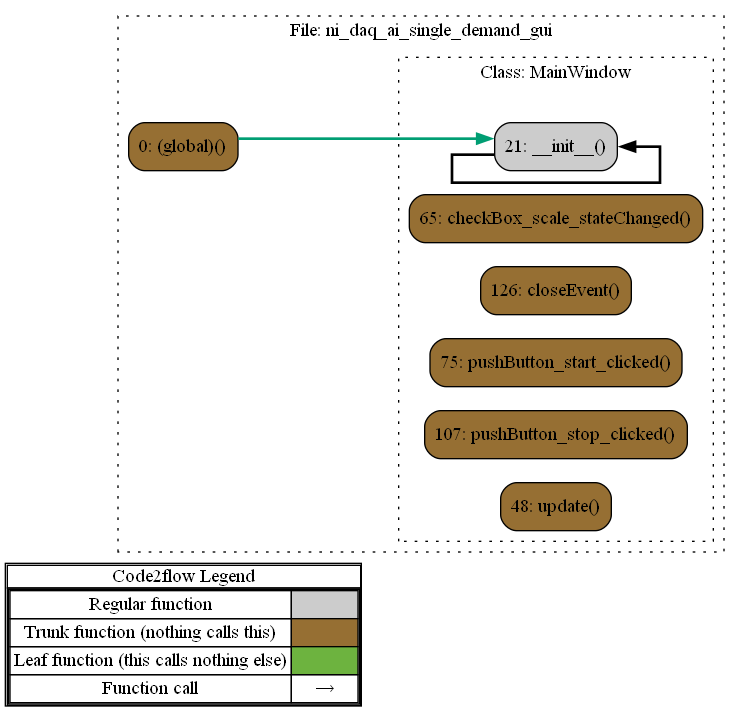 The second diagram was generated using code2flow and finds all function definitions in the code, and determines where those functions are called.
