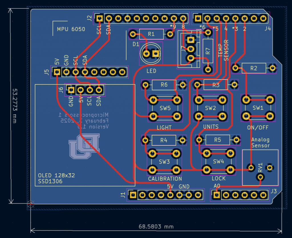 The main goal with this project is to introduce students that are learning microprocessors for the first time to the design of an Arduino Uno shield, where they can implement embedded systems concepts such as interrupt routines, timers, mixed signals and digital communications.