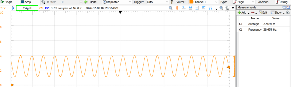 We program the Arduino to output a sinusoidal waveform and got the following output from the DAC